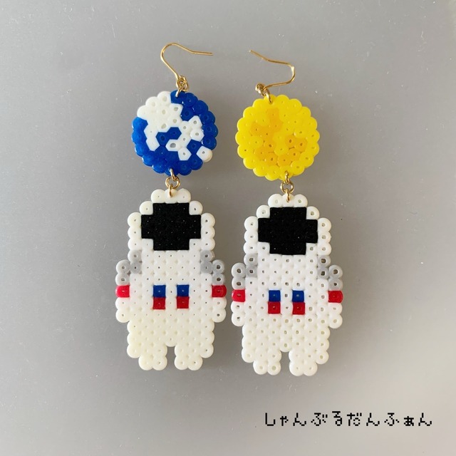 閲覧ありがとうございます。 1粒2.5ミリのアイロンビーズで作った 月と地球モチーフに宇宙飛行士さんの連なった ロマンあふれるモチーフイヤリング。 モチーフの大きさは タテ6センチ、ヨコ2.3センチ程。 左右でデザインの違うおしゃれなイヤリングです。